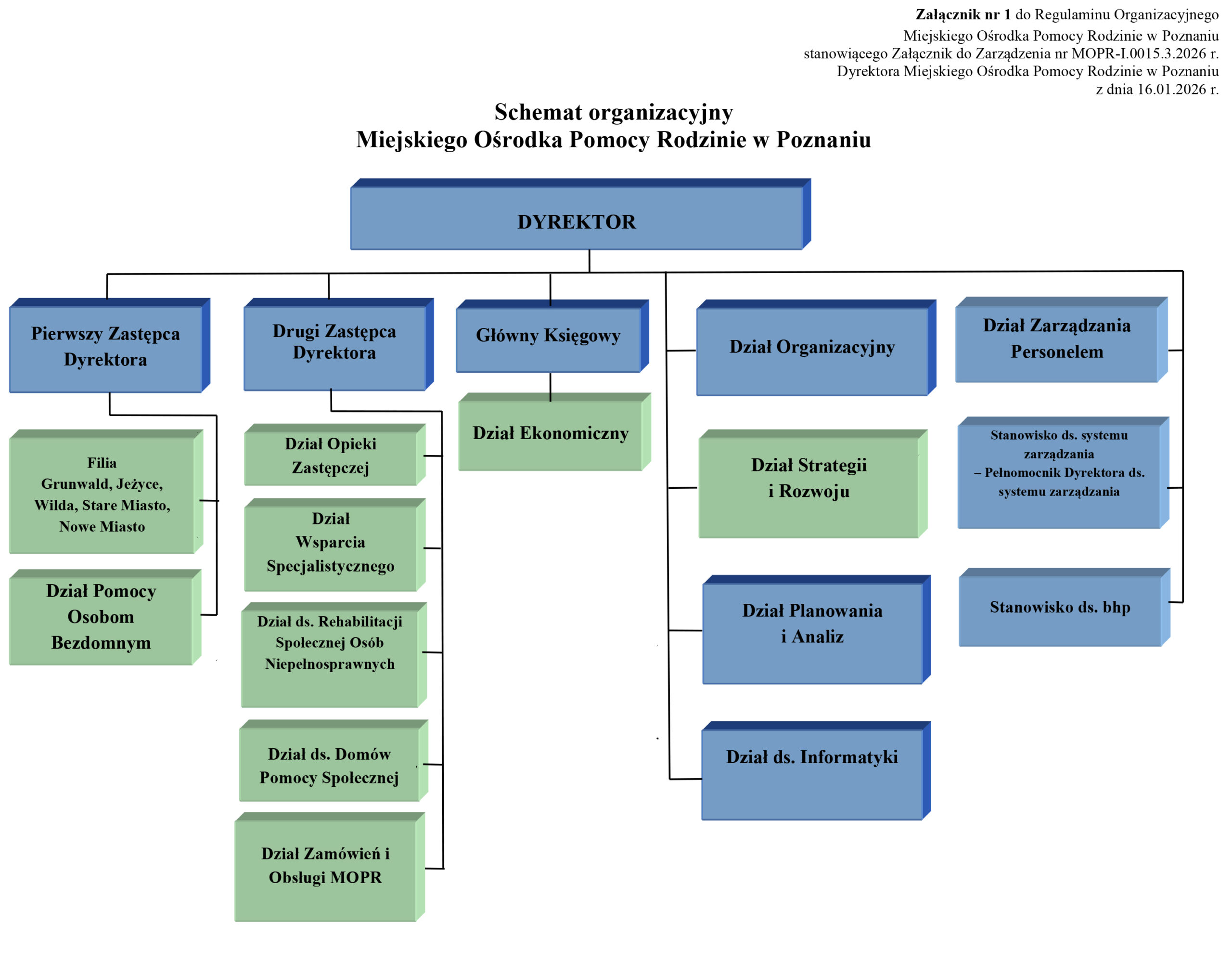 Schemat organizacyjny zgodny z treścią Regulaminu Organizacyjnego Miejskiego Ośrodka Pomocy Rodzinie w Poznaniu stanowiącego załącznik nr 1 do Zarządzenia nr MOPR-I.0015.3.2026 r. Dyrektora Miejskiego Ośrodka Pomocy Rodzinie w Poznaniu z dnia 16.01.2026 r.